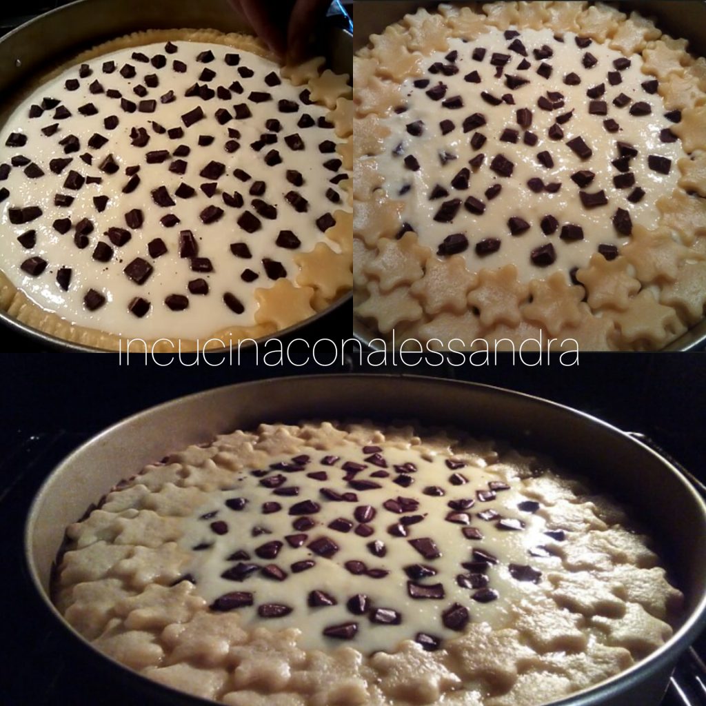 Primero de todo, prepara la masa quebrada y déjala reposar media hora. Mientras tanto, en un bol, vierte la ricotta y el azúcar, mezcla bien, añade los huevos y la cáscara de limón mezclando siempre bien. Toma un molde, úntalo y enharínalo, toma la masa quebrada, corta una porción y resérvala, extiende la masa en el molde, aproximadamente medio centímetro de grosor también para los bordes y los bordes al menos dos centímetros de alto. Pincha con un tenedor, vierte la crema sobre la masa, añade las gotas de chocolate encima. Toma la masa restante, extiéndela y haz las decoraciones que prefieras. Hornear a 180° durante unos 30/35 minutos.