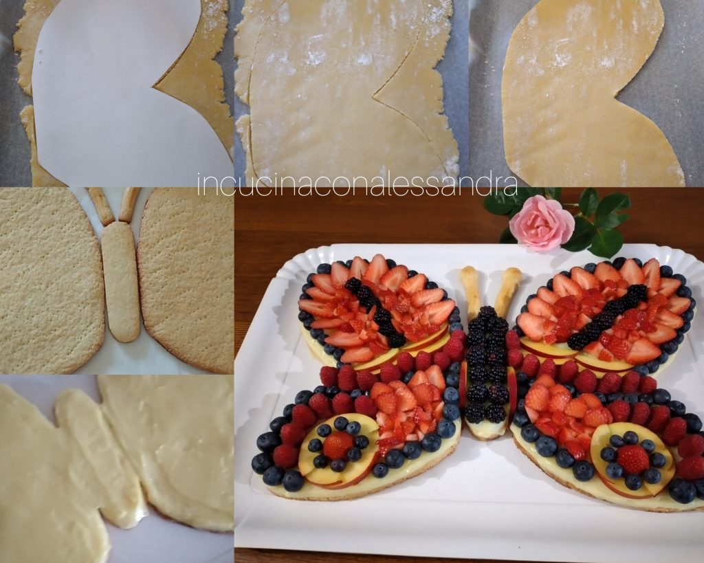 Mientras termina de cocinarse, limpiar las fresas cortando la mitad en rodajas y la mitad en cubitos, dejar 2 enteras, lavar las nectarinas y cortarlas en rodajas. Cuando la masa esté lista, colocarla en una bandeja adecuada y formar la mariposa, rellenar con la crema preparada extendiéndola bien por toda la superficie, comenzar a decorar con la fruta comenzando por los bordes con los arándanos, separar la parte superior de la parte inferior del ala con las nectarinas, si quieres prepararla como la mía, observa bien la foto, de lo contrario hazla como prefieras, puedes cambiar también la fruta. Una vez lista, rociar la gelatina sobre toda la fruta. Tu mariposa ya está lista para disfrutar.