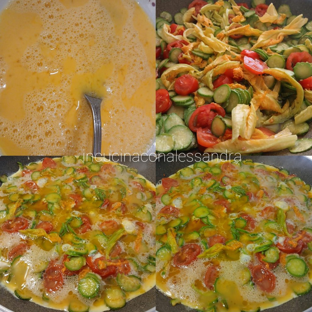 • Mientras tanto, en un plato pon los huevos y bátelos bien con un tenedor, añade un poco de sal. Cuando las verduras estén listas, vierte los huevos batidos y cocina por unos minutos, luego toma un plato llano, colócalo sobre la sartén y gírala sosteniendo el plato, después, vuelve a verter en la sartén y cocina el otro lado por unos minutos.