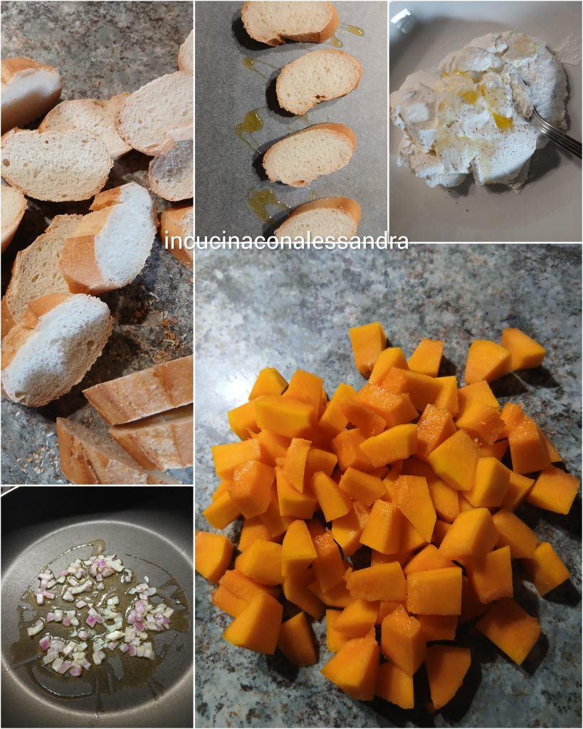 Cortar la baguette en rebanadas y meter en el horno 5 minutos para que queden un poco crujientes. Cortar la calabaza en cubos, picar la cebolla limpia y ponerla en una sartén con un poco de aceite de oliva virgen extra y sofreír ligeramente, luego agregar la calabaza, salar y mezclar. Continuar la cocción con una tapa a fuego bajo, si es necesario añadir un poco de agua. Cuando la calabaza esté cocida, en un bol poner la ricotta, un chorrito de aceite, la sal y la nuez moscada y mezclar bien. Rellenar las rebanadas de pan con la ricotta, añadir por encima los cubos de calabaza, emplatar y servir tibios. Si los quieres preparar antes, cuando los lleves a la mesa, caliéntalos un minuto en el horno.