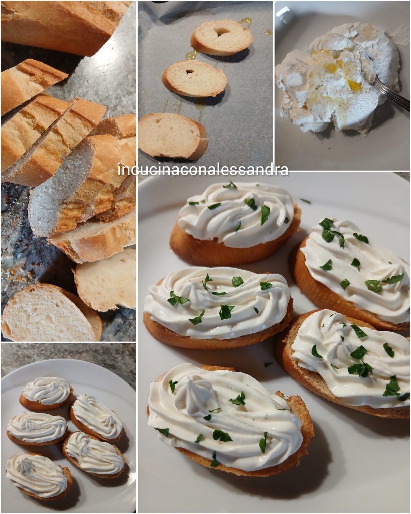 Primero corta la baguette en rebanadas y colócalas en una sartén con un poco de aceite y deja que se doren. Yo las corto en diagonal para hacerlas un poco más grandes. En un bol, coloca el queso fundido, pica el perejil y añádelo al queso y mézclalo bien hasta formar una crema suave. Luego ponlo en una manga pastelera y rellena las tostadas, coge las aceitunas negras horneadas, yo las encontré listas en el supermercado. De no ser así, basta con ponerlas en el horno y dejarlas secar un poco, córtalas por la mitad y colócalas encima de la crema. Espolvorea con un poco de perejil picado, si te gusta, puedes poner un poco de ajo en el pan caliente. Tu aperitivo está listo, rápido y delicioso.