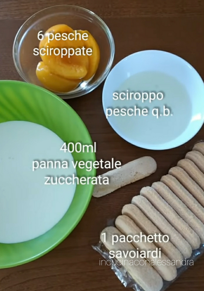 Tomar un bol preferiblemente de vidrio y forrarlo con film para alimentos, abrir los melocotones y verter en un bol pequeño el almíbar, 4 melocotones los cortáis en trocitos, 2 en rodajas. Montar bien la nata, debe quedar bien firme. Tomar los bizcochos de soletilla y empaparlos en el almíbar, cuidado de no mojarlos demasiado, luego colocar dentro del bol, hay que cubrir todas las paredes, en este punto verter un poco de nata, hacer una capa de al menos un par de centímetros de melocotones, luego otra capa de nata, finalmente cerrar con una capa de bizcochos de soletilla, cerrar con el film para alimentos, presionando ligeramente. Poner en el congelador al menos 1 hora, 1 hora y media, luego quitar el film que cierra la base, colocar un plato para servir encima y dar la vuelta, levantar el bol y luego quitar poco a poco el film. Cubrir el zuccotto con la nata restante tratando de nivelar bien, si lo servís inmediatamente, decorar con los melocotones y emplatar, si lo vais a disfrutar después de un par de horas, volver a poner en el congelador y decorar antes de servir.