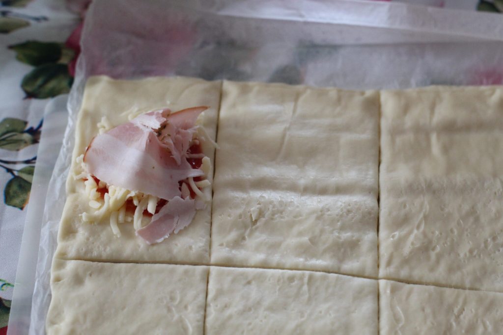 Para preparar el árbol de Navidad con base de pizza lista, primero desenrolla 1 rollo de base de pizza ya lista y córtala haciendo 4 tiras horizontales y 4 verticales ayudándote con un cuchillo o con una rueda cortadora de pizza. Vierte la salsa de tomate en un bowl pequeño y añade sal. Si quieres darle más sabor, también puedes añadir orégano seco. Pon 1 cucharita de salsa sobre cada cuadrado de pizza, añade un poco de mozzarella rallada para pizza y un trocito de porchetta en lonchas. O cualquier embutido que te guste. Toma el cuadradito de pizza y cierra bien desde los bordes hacia el centro de manera que el relleno quede bien dentro y se forme una bolita de masa.