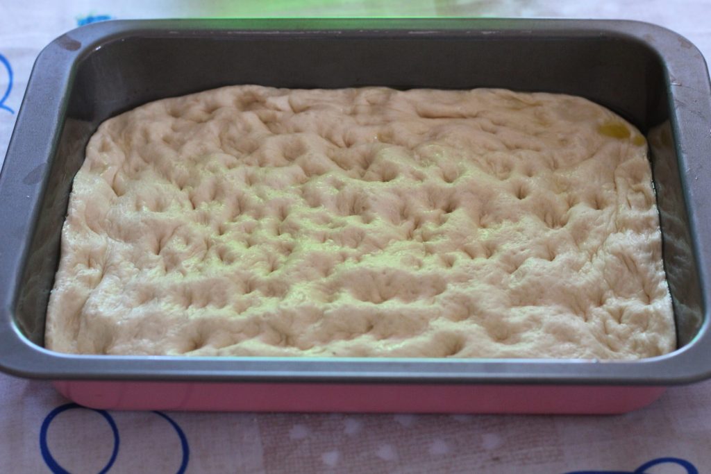 Pasadas las horas, retoma la masa. Unta bien de aceite de oliva virgen extra una bandeja (puedes utilizarla redonda o rectangular como hice yo. Mi bandeja con bordes ligeramente altos es de 22 x 28). Toma la masa con las manos untadas de aceite y extiende en la bandeja presionando con las yemas de los dedos para dejar surcos.