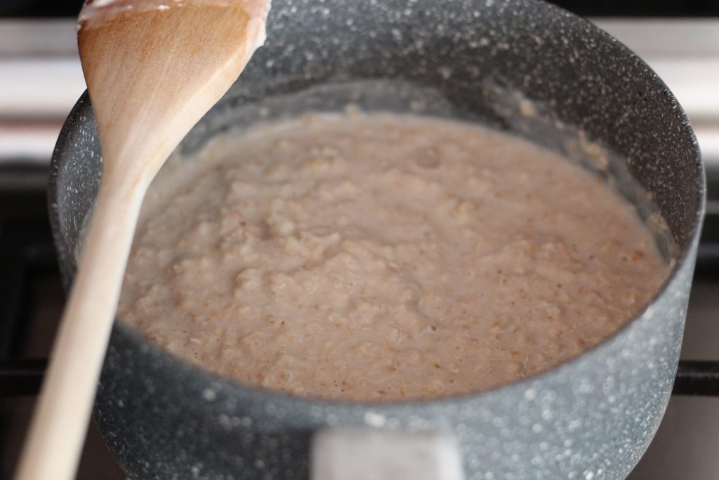 Ahora pon en una cazuela el agua, la leche entera y los copos de avena. Remueve bien con una cuchara de madera y ponlo a cocer todo a fuego lento durante 5 minutos. Debe volverse bastante espeso. Decide tú el nivel de cocción que quieres, si lo prefieres más denso o más líquido.