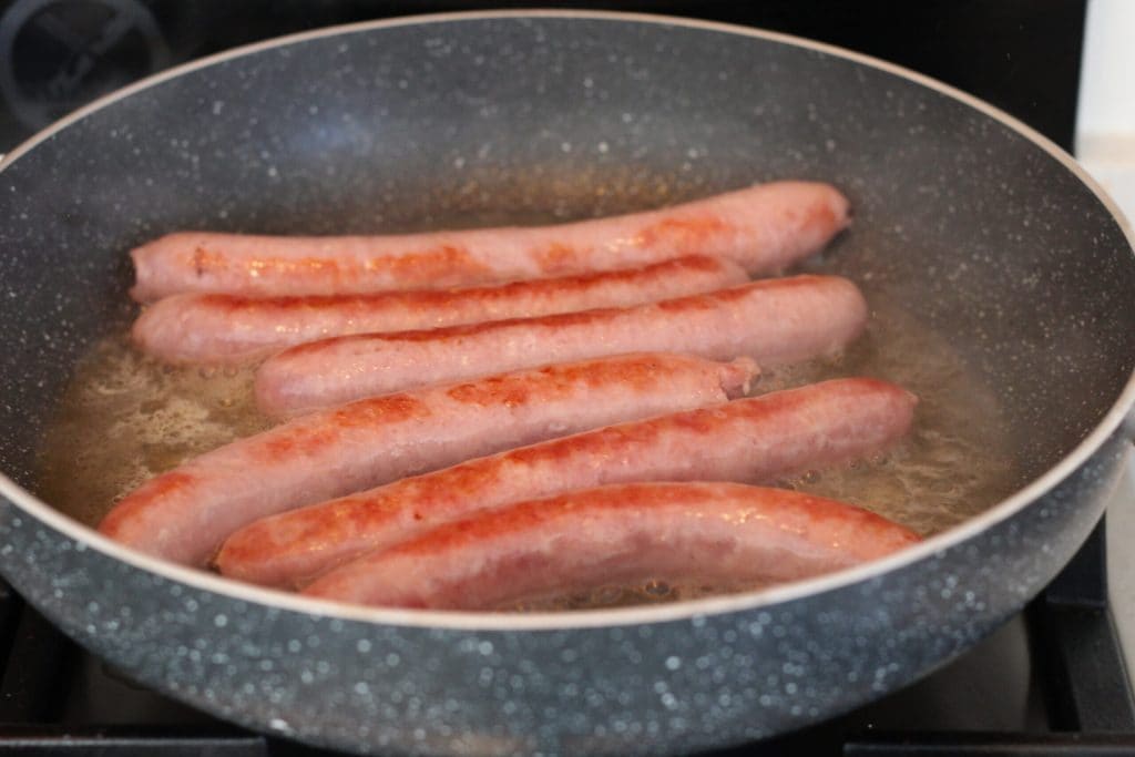 • 6 salchichas de cerdo, frescas, cocidas, en sartén