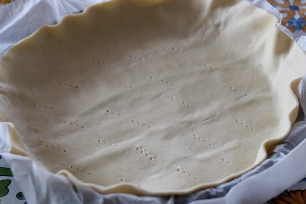 Pasos para preparar la tarta de masa brisée con calabacines, salami y scamorza ahumada