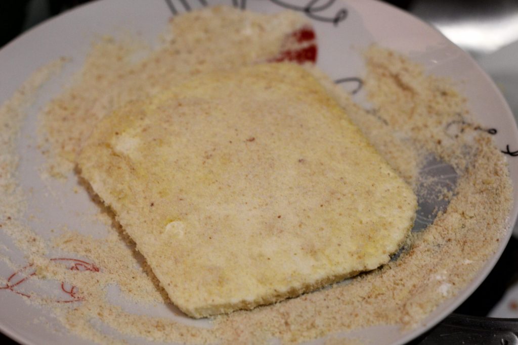 • Por último, pasadla por el pan rallado. Este último debe adherirse bien y cubrir toda la superficie del queso. Luego poned las rodajas en un plato, si podéis no las pongáis una encima de la otra, sino colócalas una al lado de la otra.