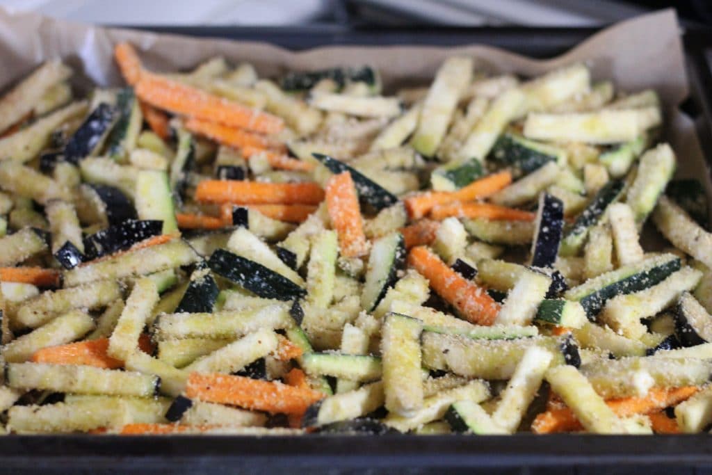 • Para preparar las verduras gratinadas al horno, lo primero que debes hacer es tomar un calabacín, lavarlo bien y quitarle los extremos, luego corta los calabacines primero por la mitad y luego en palitos no demasiado gruesos. Haz lo mismo con la berenjena, lávala bien, quita las partes exteriores y córtala primero en rodajas y luego en palitos. Ahora toma las zanahorias, pélalas, quítales los extremos y primero córtalas en trozos, luego en palitos. Pon todas las verduras cortadas en un bol grande, añade aceite de oliva virgen extra, 5 cucharadas de pan rallado, 2 cucharadas de pecorino rallado, sazona con sal y pimienta y añade las hierbas aromáticas a tu gusto. Yo he utilizado las que vienen ya preparadas en tarro de vidrio, pero si quieres puedes tomar romero y salvia y picarlas finamente. Si te gusta, también puedes añadir orégano seco.