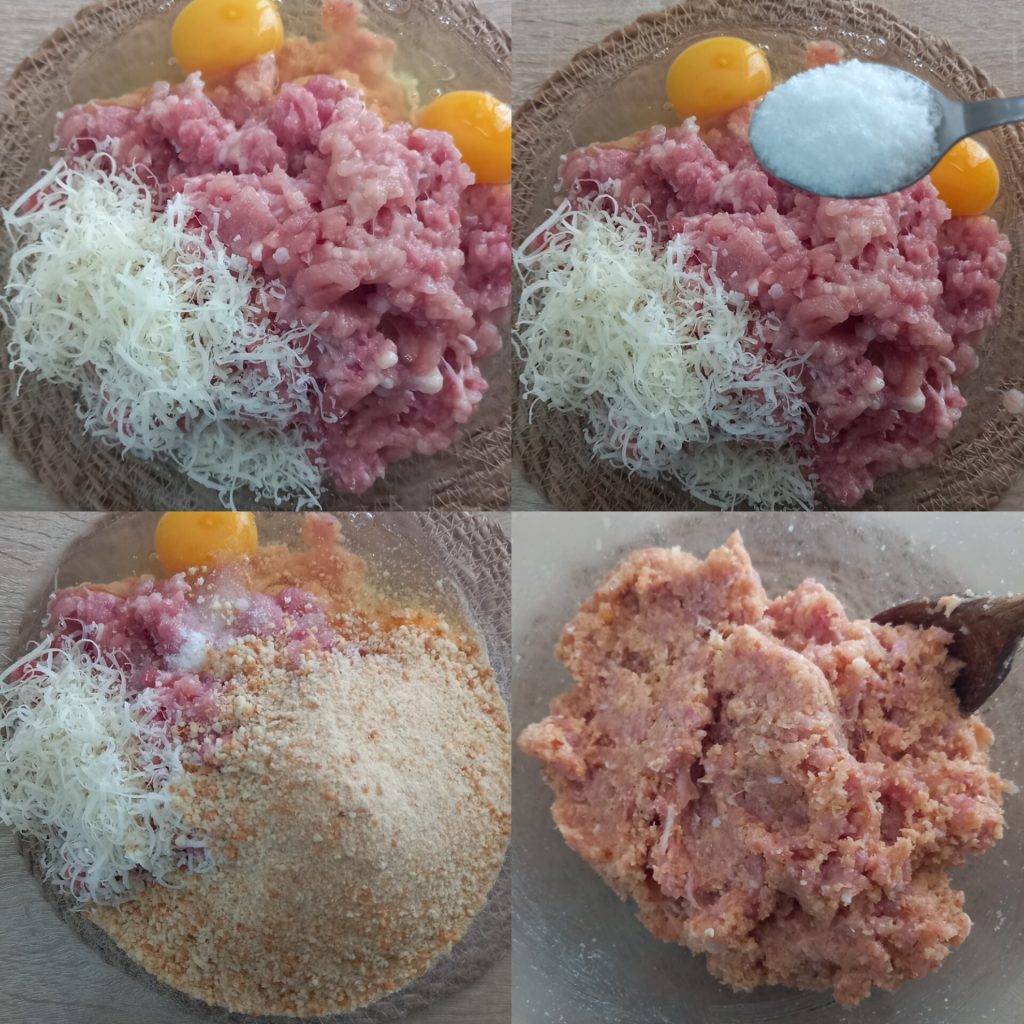 Primero, poned en un bol la carne picada de pollo, los huevos, el queso parmesano rallado, la sal, el pan rallado o la miga de pan.