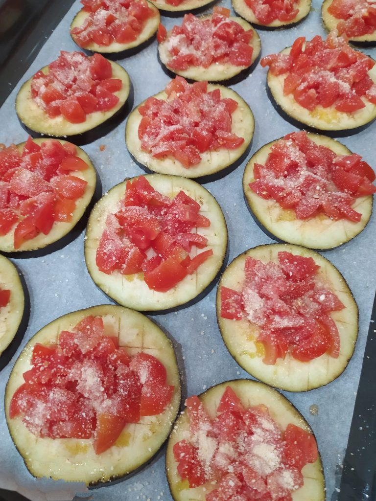 Muy fáciles de preparar: basta con cortar las berenjenas en rodajas, condimentarlas con un chorrito de aceite, una pizca de sal y los tomatitos, luego hornearlas.