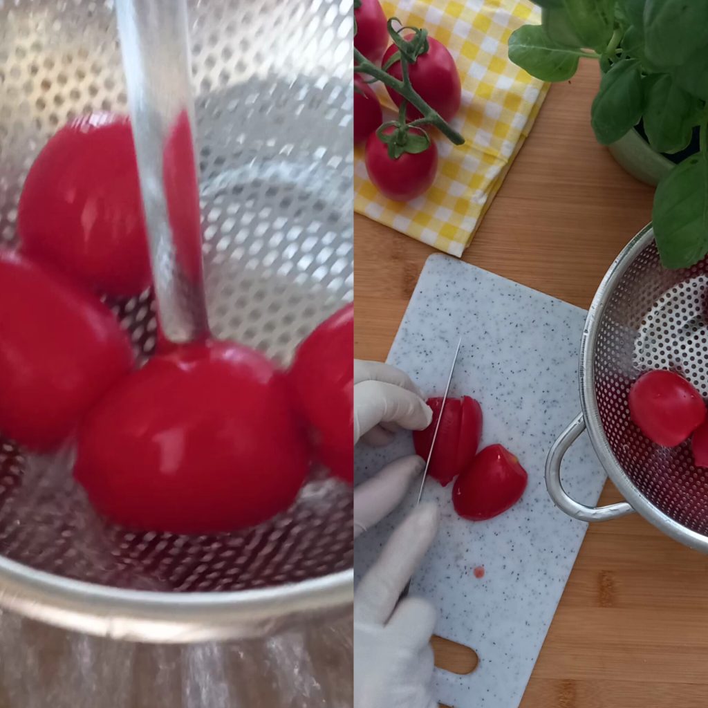 Lavad los tomates cherry y cortadlos en pequeños trozos.