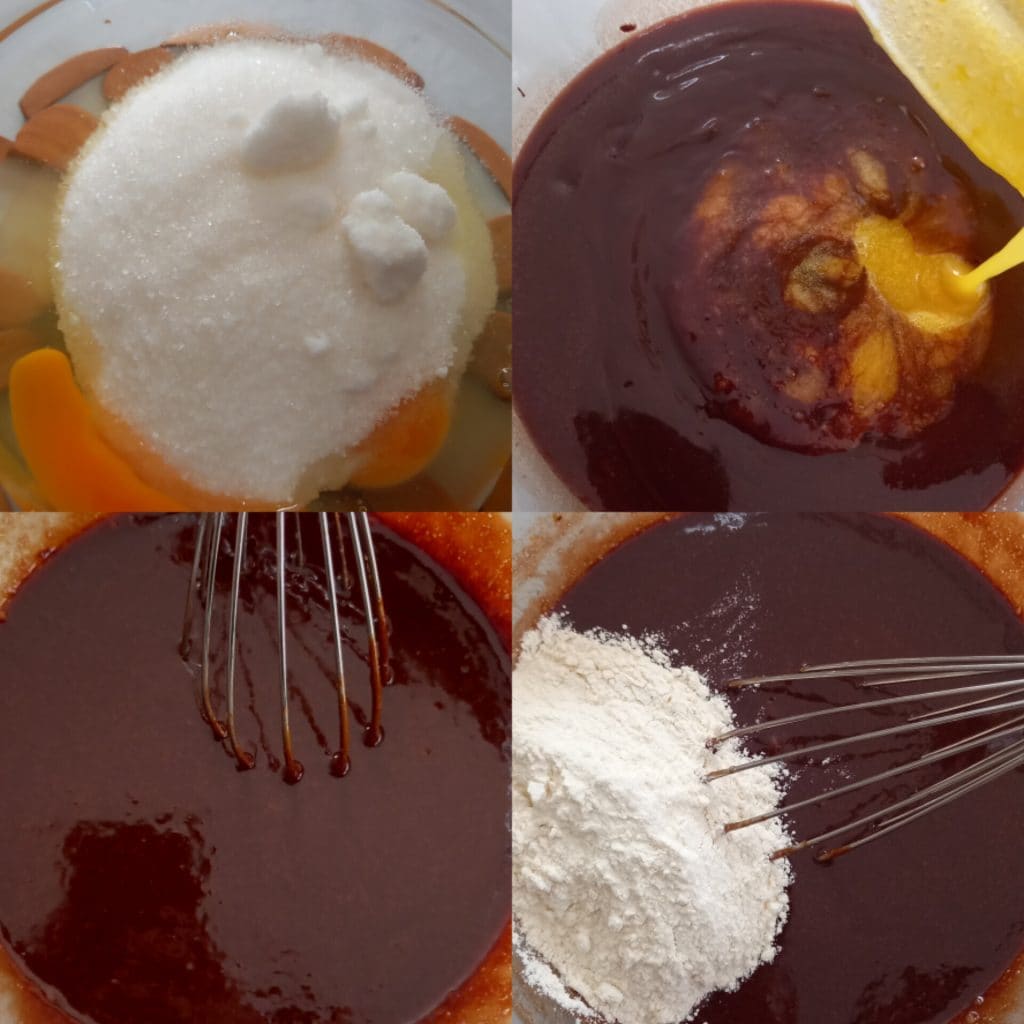 Naturalmente, como cada receta tradicional, existen muchas versiones con pequeñas modificaciones: veteados con crema, con chocolate blanco, con nutella y en versión cheesecake. La receta que os propongo hoy es realmente muy sencilla y se prepara en pocos minutos. Basta con derretir el chocolate con la mantequilla y aparte batir con unas varillas los huevos junto con el azúcar. Trabajando bien todo se vierte luego en un molde.