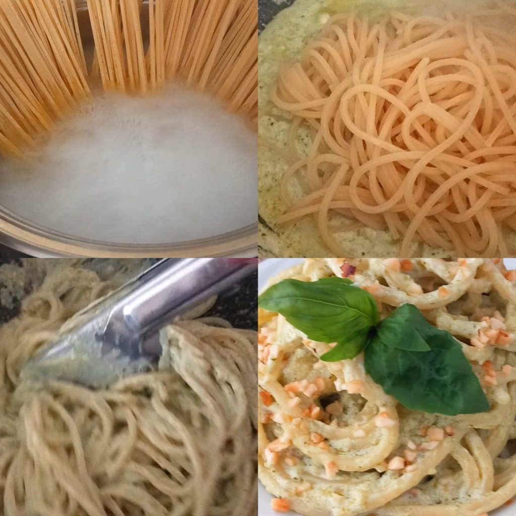 Una vez transcurrido el tiempo de cocción, con una pinza de cocina tomad los espaguetis y sumergidlos directamente en la crema de ricotta, pesto y avellanas.