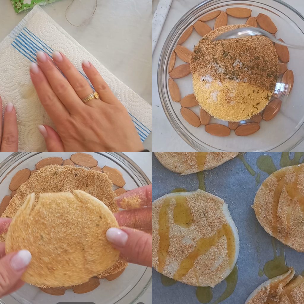 Tomad un paño de cocina y secad cada rodaja con cuidado. Tomad un bol e introducid el pan rallado, la harina de maíz, la sal y finalmente el cebollino. Mezclad todo con un tenedor.