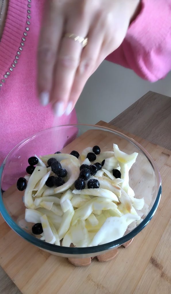 Tomad un bol grande, poned los hinojos cortados y condimentad con aceite de oliva virgen extra y aceitunas deshuesadas.