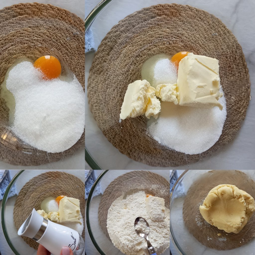 Tomad un bol, añadid un huevo, el azúcar, la mantequilla a temperatura ambiente, una pizca de sal, la bolsita de vainilla y finalmente toda la harina.