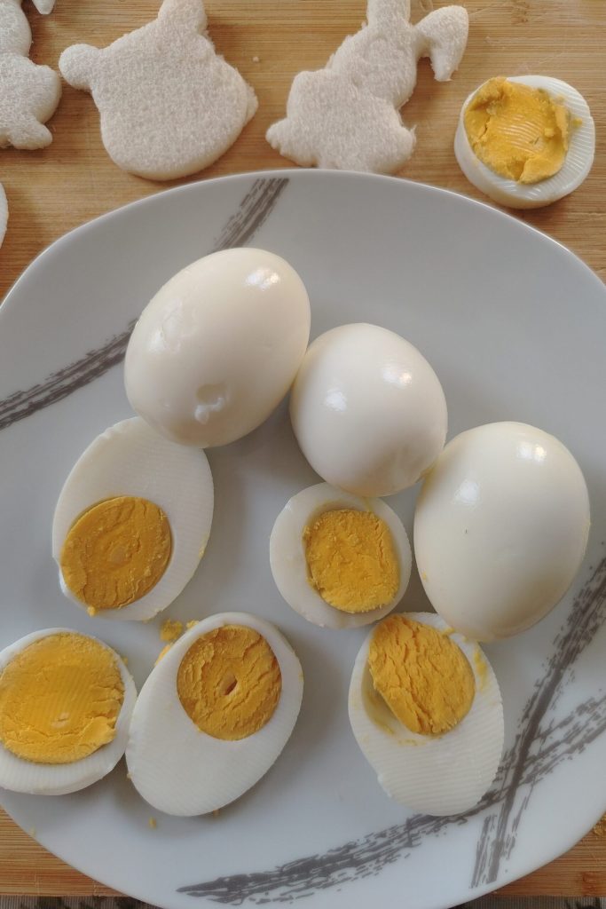 Reservad dos huevos para la decoración. Los restantes huevos cocidos se cortan por la mitad para el relleno.