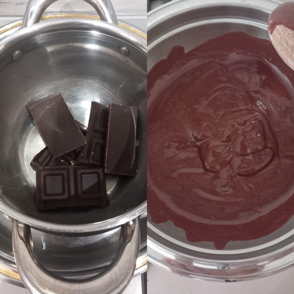 Como primer paso, fundir una parte del chocolate negro al baño maría. (100 g de chocolate servirán para la cobertura final).