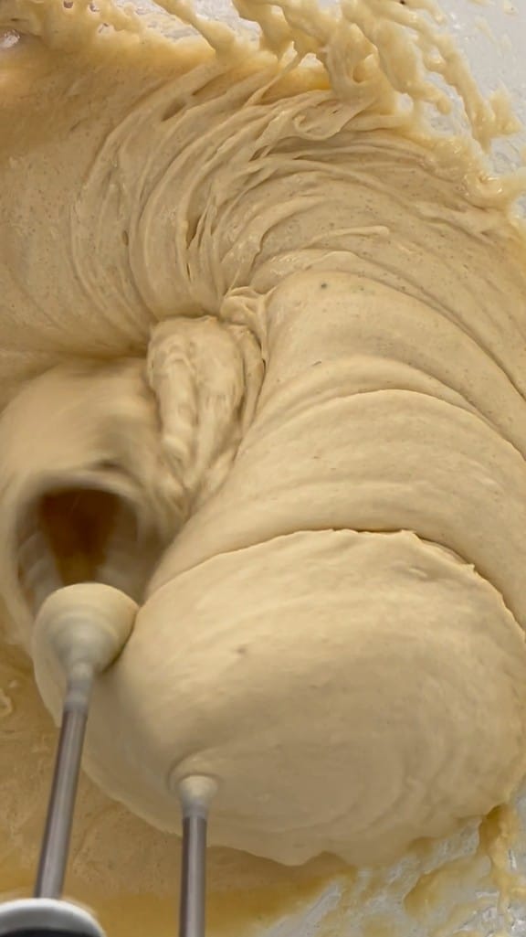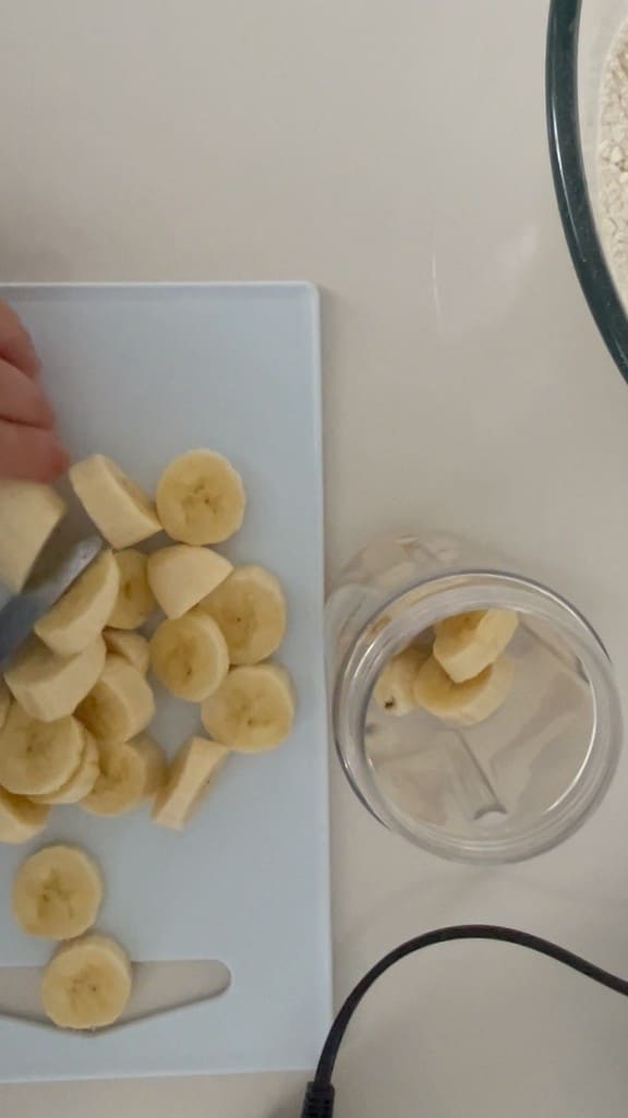 En este punto, añadir los líquidos y el puré de plátano a los ingredientes secos.