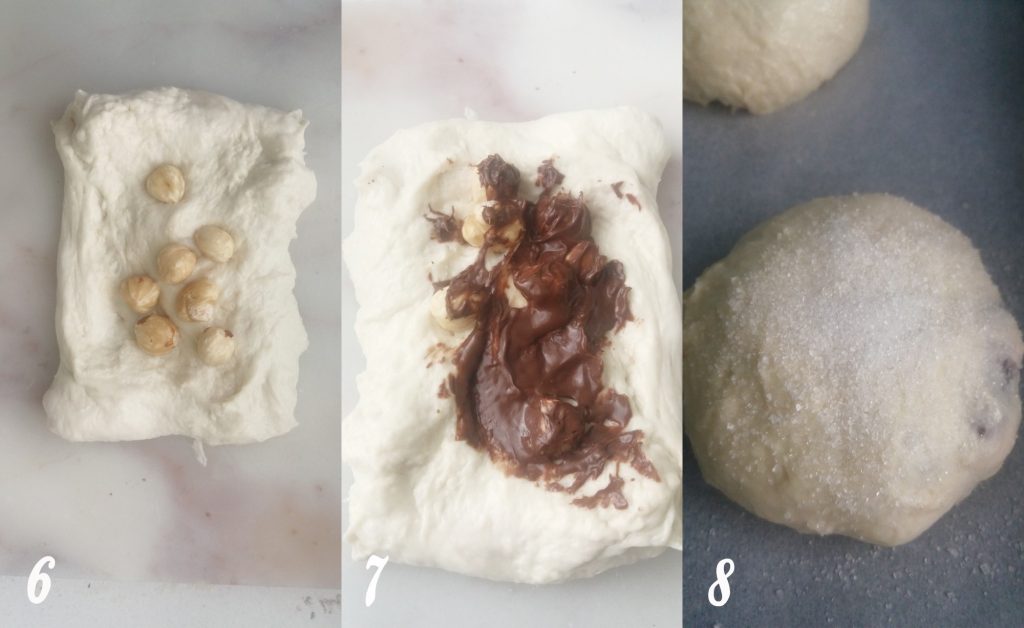 En este punto, tomar un trozo de masa, extenderlo con las manos y verter encima primero las avellanas(6) luego la Nutella(7) y cerrar juntando los extremos al centro formando una bola que colocaremos en una bandeja de horno con papel de horno a fermentar otras 12 horas, duplicará su volumen(8). Espolvorear con azúcar y hornear en horno estático precalentado a 180° durante 20 min