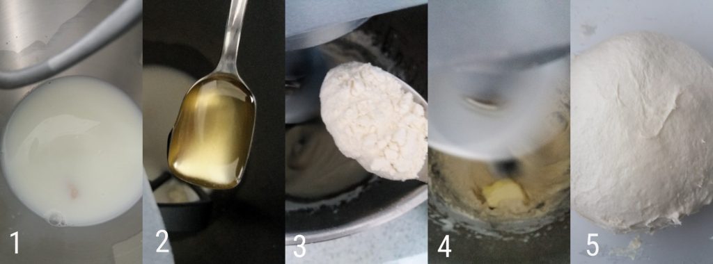 En la batidora, insertar la leche y disolver la masa madre en trozos con el azúcar (1). Añadir la cucharadita de miel(2). En este punto, poco a poco las harinas(3). Siempre poco a poco los trozos de mantequilla ablandada a temperatura ambiente(4). Cuando la masa se adhiera al gancho, retirarla y transferirla a la superficie de trabajo, formar una bola lisa y dejar reposar durante 6 horas en el horno apagado con la luz encendida(5)
