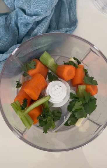 En un picador, triturar finamente las zanahorias, el apio, el ajo y el perejil.