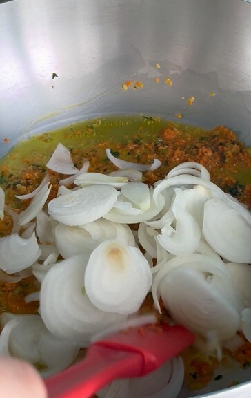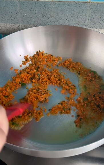 En una sartén, sofreír con un poco de aceite de oliva virgen extra la mezcla de aromas.