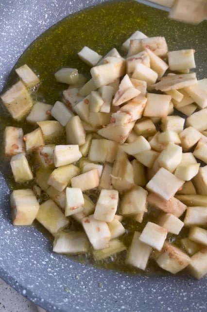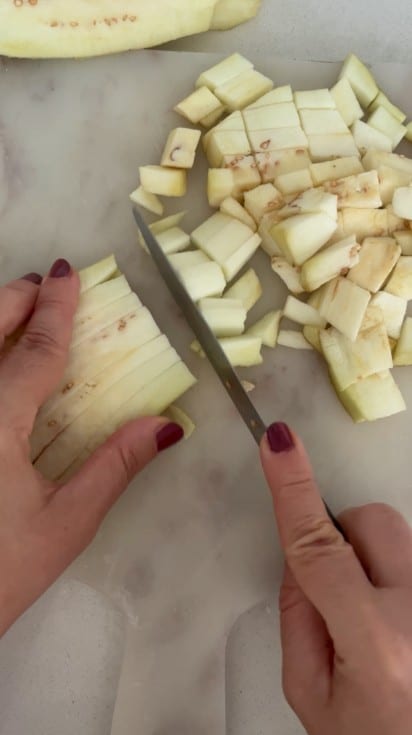 • Lo primero que hay que hacer es lavar y quitar la piel negra de las berenjenas. Cortar las berenjenas en trozos pequeños