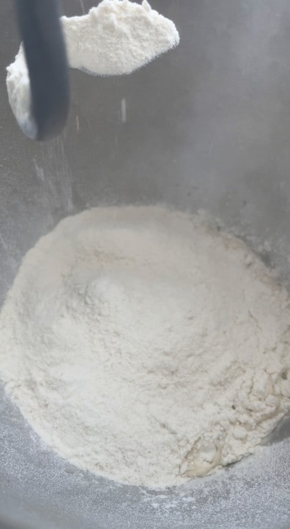 Trabajar a la primera velocidad con la amasadora hasta obtener este resultado, tarda aproximadamente 1 minuto. La mantequilla debe quedar bien distribuida pero no absorbida. Así que incluso si ves la masa con trozos de mantequilla esparcidos, no te preocupes. Enharinar ligeramente la superficie de trabajo y verter la masa