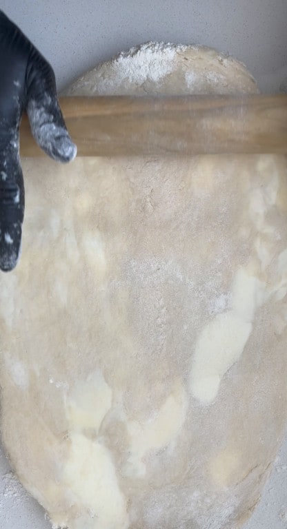 Enharinar la superficie de trabajo y comenzar con el rodillo a extender el hojaldre siempre teniendo cuidado de trabajarlo con la apertura a la derecha