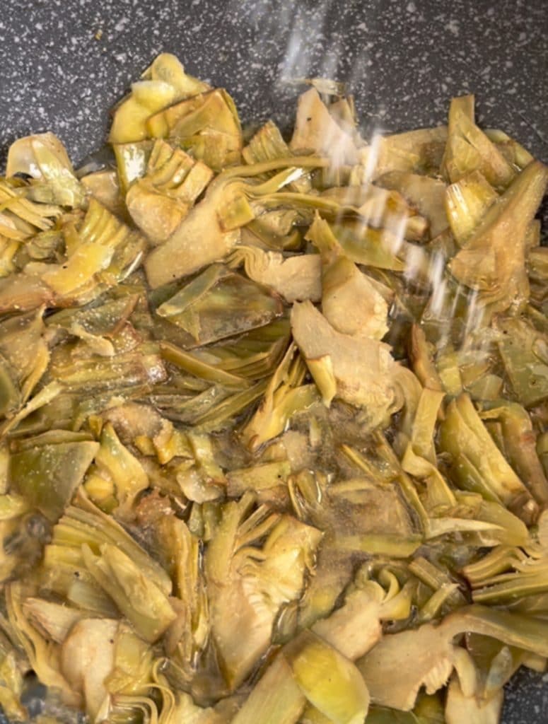 Verter las alcachofas previamente lavadas y cortadas en rodajas finas. Cocinar durante 15 min y reservar.