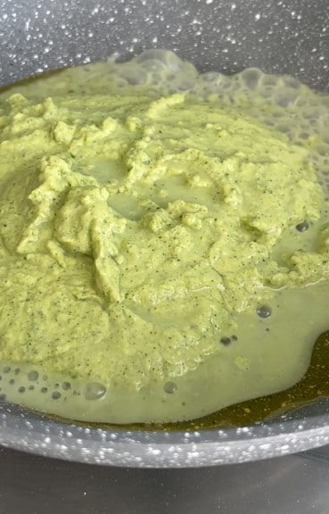Calienta la sartén con un poco de aceite de oliva virgen extra y vierte la crema obtenida con un cucharón de agua de cocción de la pasta