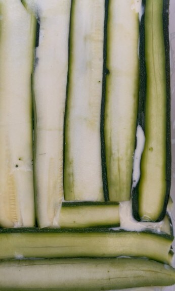 Colocar las rodajas de calabacín previamente cortadas finas con una mandolina sin sobreponerlas