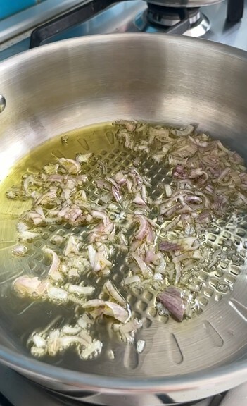 En una olla calentar el aceite con un poco de chalota. Añadir las cabezas de las gambas aplastándolas ligeramente.