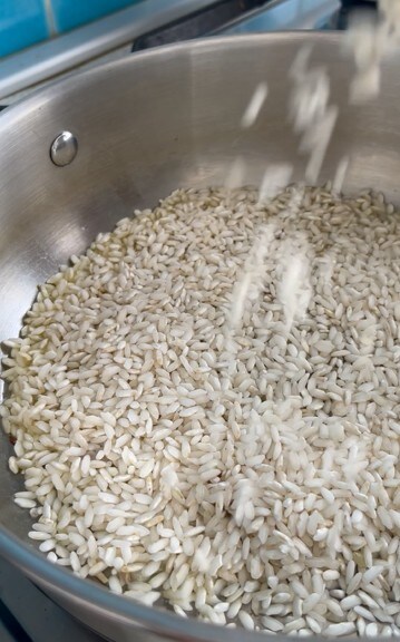 Continuar removiendo el risotto y añadir el caldo cada vez que el arroz lo requiera.