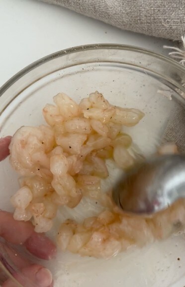Cortar las gambas en trozos y sazonar con sal, aceite de oliva y pimienta