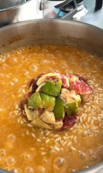 Servir enseguida el risotto de higos con las avellanas tostadas