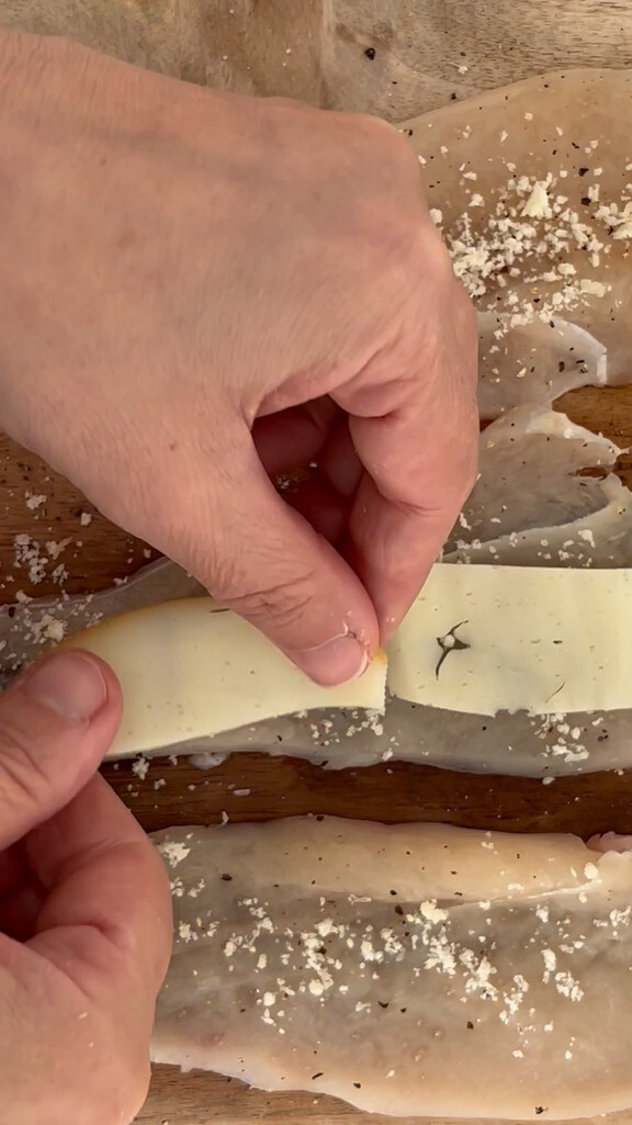 Enrollar delicadamente nuestras rodajas de pechuga de pollo