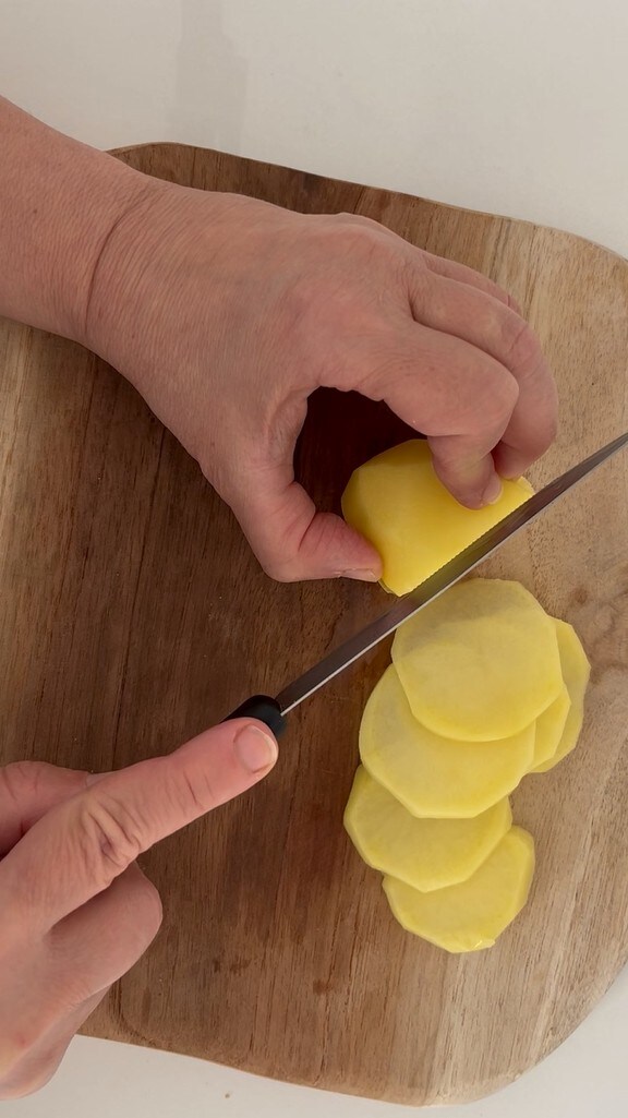 Preparar también un acompañamiento rápido cortando en rodajas finas las patatas