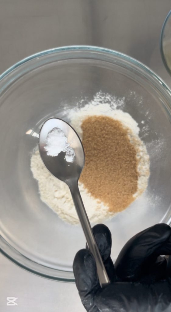 En un bol, unir los polvos tamizados, es decir, la harina, el almidón de patata, el cacao y la levadura para dulces.