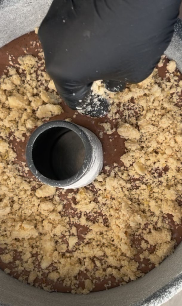 La base de la rosca es una masa suave y rica en chocolate, mientras que el crumble es una costra crujiente a base de harina, azúcar, mantequilla y ralladura de naranja. La combinación de estas dos texturas crea una experiencia sensorial única.