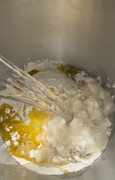 Comenzar con la preparación de la masa loca. En una batidora, pero si no tienes una batidora, puedes hacerlo tranquilamente a mano, añadir la harina y la cucharada de sal.