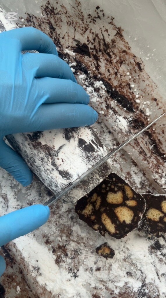 Con una mezcla de galletas crujientes, cacao amargo y mantequilla derretida, este «salchichón» no cocido se prepara en pocos minutos y no requiere el uso del horno, lo que lo hace ideal para un antojo repentino de dulce o para una fiesta con amigos. Su forma característica lo hace divertido de servir y de ver, mientras que su suavidad en el paladar lo convierte en una experiencia irresistible. Es un dulce que evoca los sabores de antaño, capaz de conquistar a grandes y pequeños. Como buena tarantina hice una variación, es decir, sustituí la leche con café y un poco de licor Borsci S. Marzano y la adición de granillo de avellanas