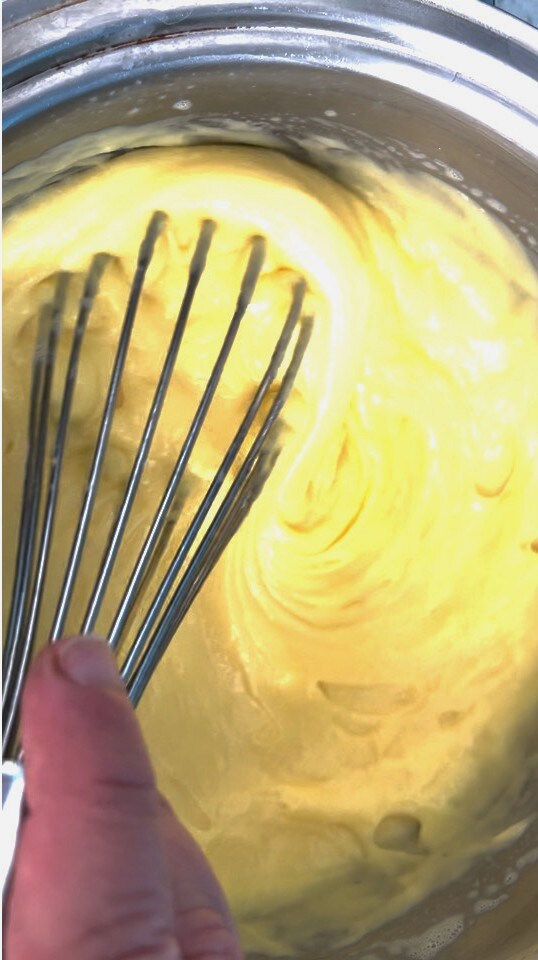 En este punto, la leche ya estará caliente y se puede añadir al bol con los huevos.