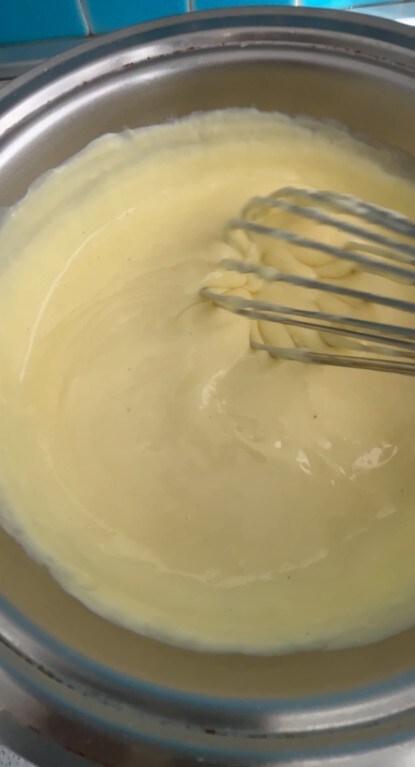 Mientras tanto, calentar la leche al fuego con un hilo de esencia natural de vainilla, hasta casi hervir