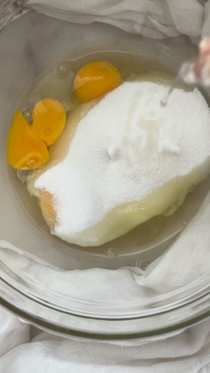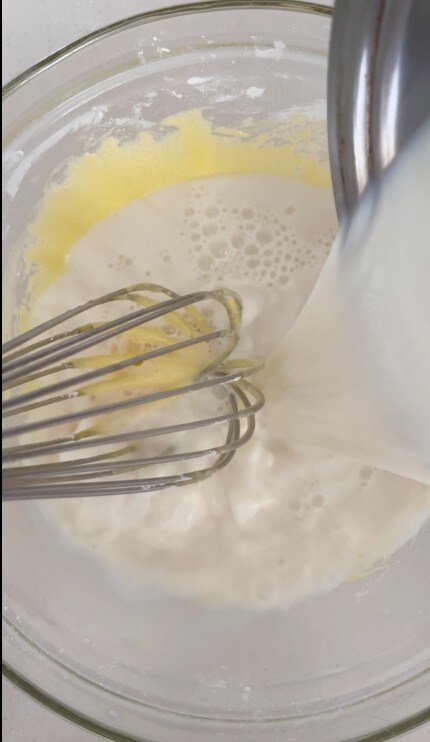 Comienza a preparar la crema pastelera, en un bol, con unas varillas, combina las yemas y el azúcar.