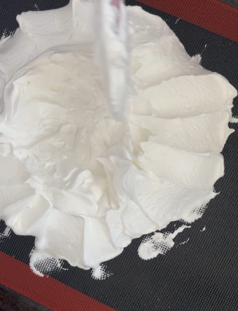 • Ahora en una bandeja cubierta con papel de horno o un tapete para dulces, verter el merengue y darle la forma deseada haciendo rayas laterales con la espátula de abajo hacia arriba. Cocer en horno estático precalentado a 130ºC durante los primeros 10 minutos y luego bajar a 90ºC y continuar la cocción por otros 90 minutos. Al finalizar la cocción, dejar enfriar la pavlova en el horno con la puerta ligeramente abierta ayudándote con el mango de una cuchara de madera. Yo suelo prepararla por la noche y la dejo en el horno apagado toda la noche.