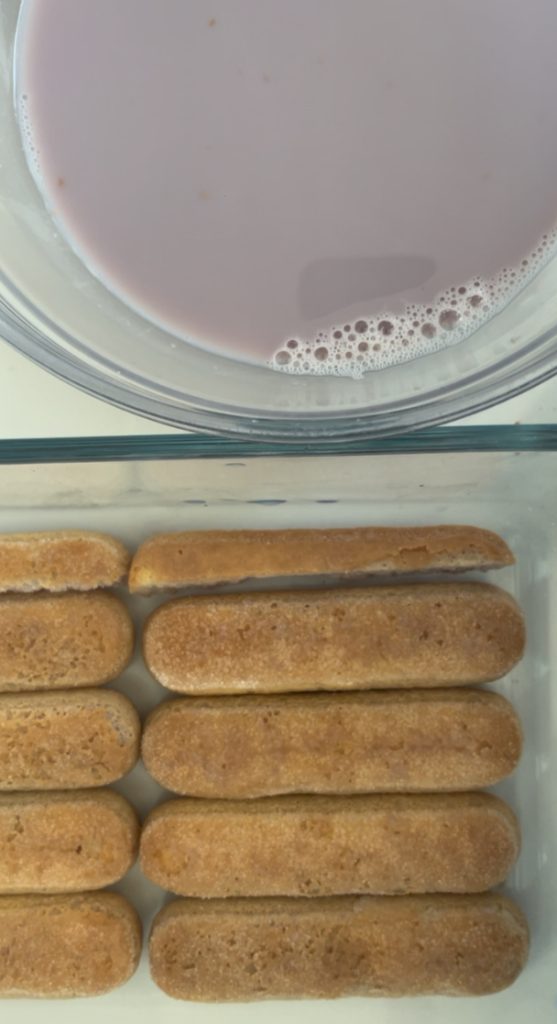 Comenzar a mojar los bizcochos de soletilla y colocarlos uno al lado del otro.