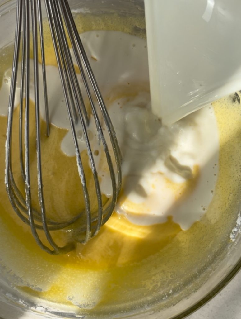 y la leche (sirve para obtener una zeppola más coloreada en la cocción, pero si sois intolerantes, podéis sustituirla tranquilamente con la misma cantidad de agua).